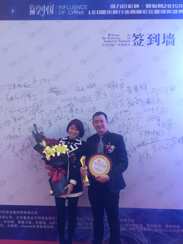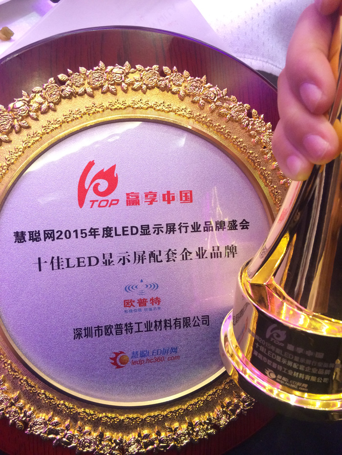赢享中国.强力巨彩杯2015年LED显示屏行业高峰论坛暨颁奖盛典12月15日在深圳西丽麒麟山庄顺利召开。恭喜得奖的各位行业大伽及企业,同时也恭喜深圳欧普特工业材料有限公司获得十佳LED显示屏配套企业品牌